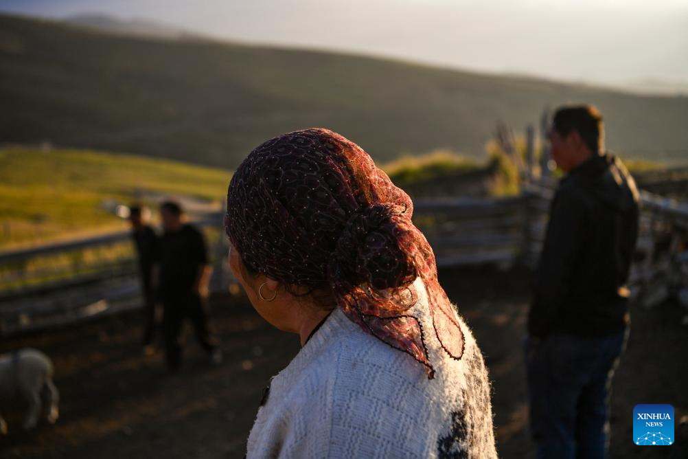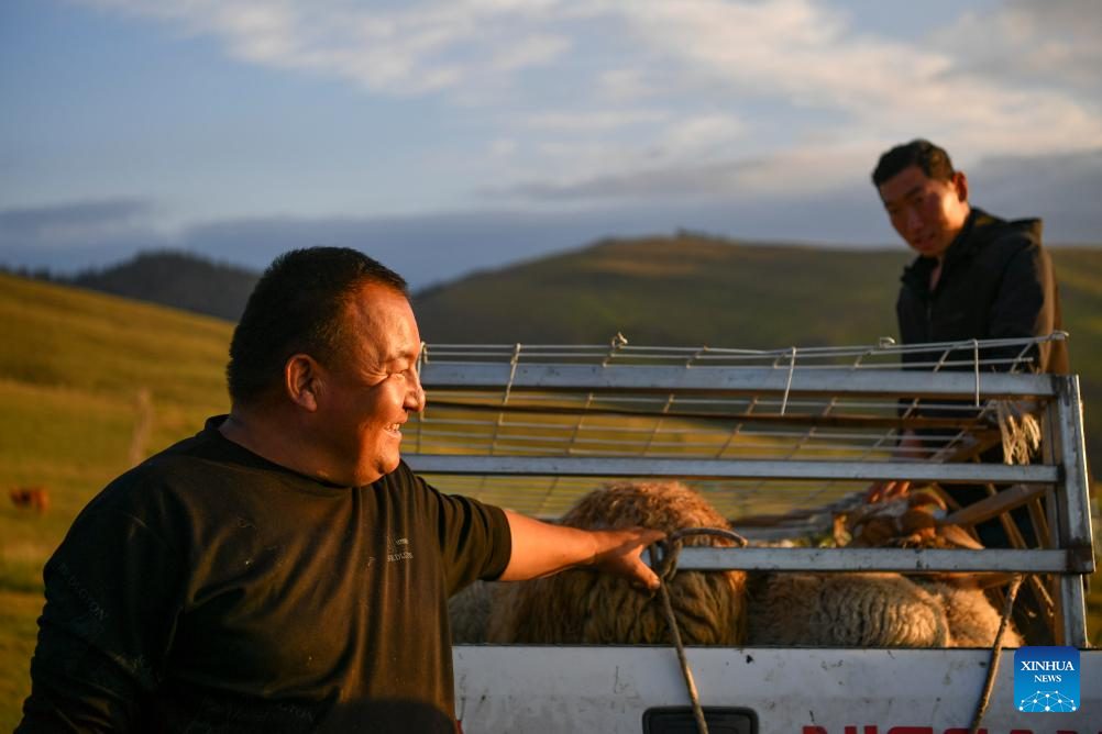 A man buys sheep at Solbastiao alpine pasture in the Tianshan Mountains area in Miaoergou Township of Changji, northwest China's Xinjiang Uygur Autonomous Region, Aug. 13, 2023. (Xinhua/Hu Huhu)