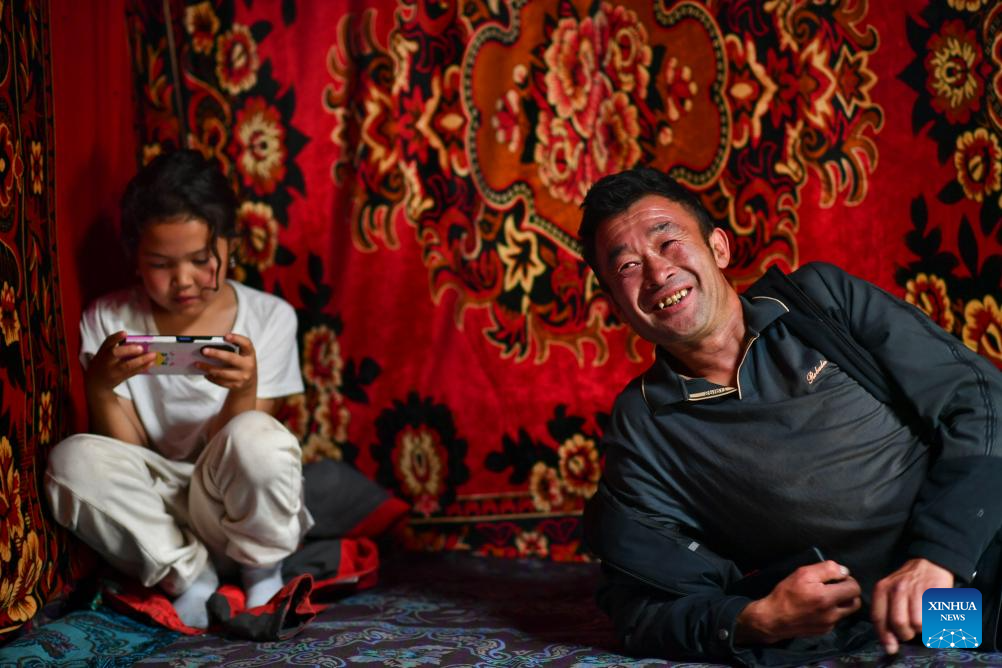 A herder and his daughter rest at home at Solbastiao alpine pasture in the Tianshan Mountains area in Miaoergou Township of Changji, northwest China's Xinjiang Uygur Autonomous Region, Aug. 14, 2023. (Xinhua/Hu Huhu)