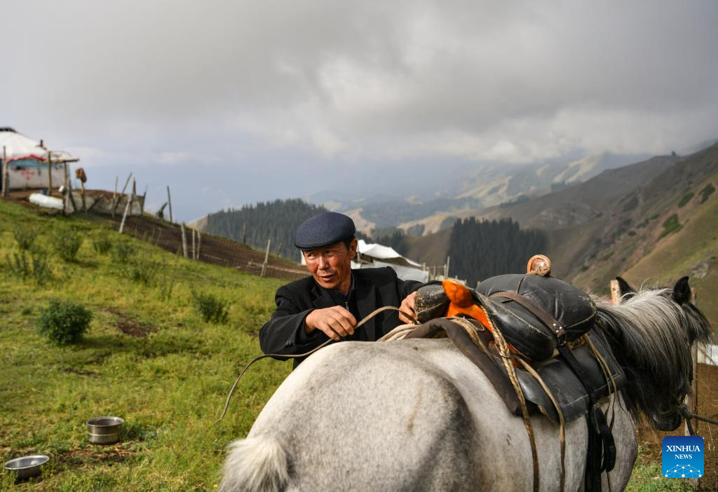 Herders get together at Solbastiao alpine pasture in the Tianshan Mountains area in Miaoergou Township of Changji, northwest China's Xinjiang Uygur Autonomous Region, Aug. 12, 2023. (Xinhua/Hu Huhu)