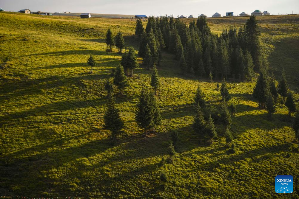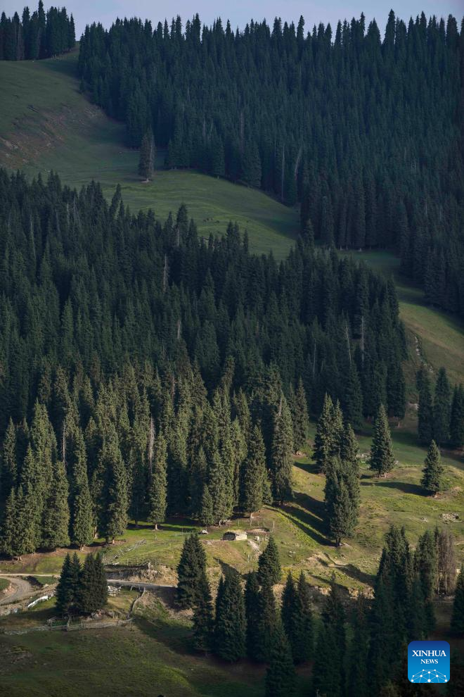 This photo taken on Aug. 13, 2023 shows a view at Solbastiao alpine pasture in the Tianshan Mountains area in Miaoergou Township of Changji, northwest China's Xinjiang Uygur Autonomous Region. (Xinhua/Hu Huhu)