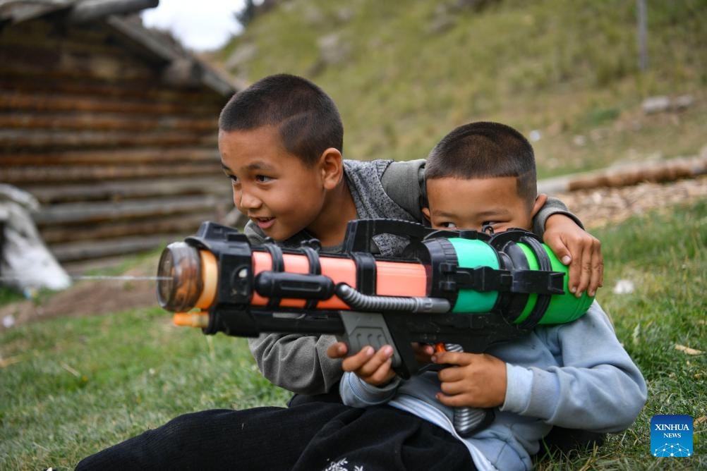 Two boys play games at Solbastiao alpine pasture in the Tianshan Mountains area in Miaoergou Township of Changji, northwest China's Xinjiang Uygur Autonomous Region, Aug. 12, 2023. (Xinhua/Hu Huhu)