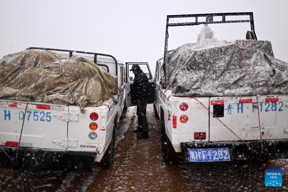 A staffer with the Drolkar Lake protection station of the Hoh Xil management office encounters with heavy snowfall on the way to the Drolkar Lake protection station in Hoh Xil, northwest China's Qinghai Province, June 16, 2023. (Xinhua/Zhang Hongxiang)