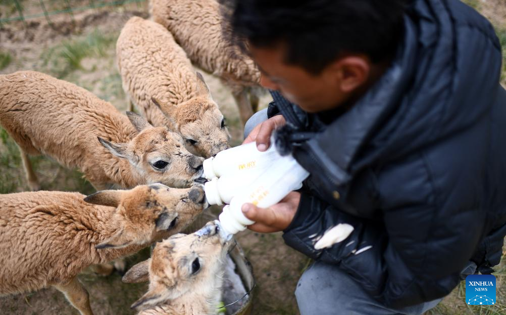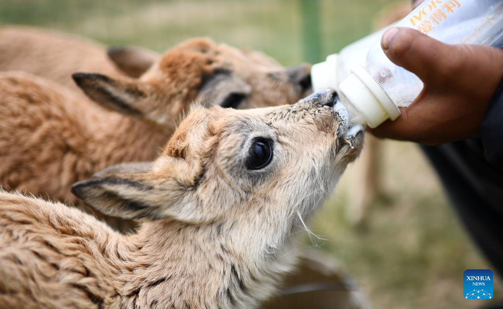 A staffer of the Hoh Xil management office feeds rescued Tibetan antelope calves in Hoh Xil, northwest China's Qinghai Province, July 28, 2023. (Xinhua/Zhang Hongxiang)