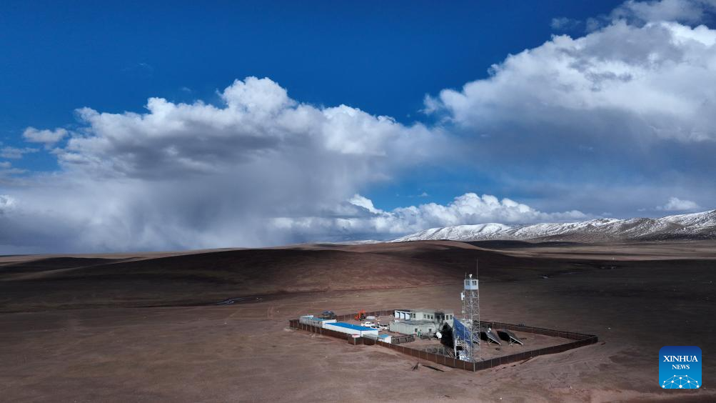 This aerial photo taken on June 17, 2023 shows a view of the Drolkar Lake protection station of the Hoh Xil management office in Hoh Xil, northwest China's Qinghai Province. (Xinhua/Zhang Hongxiang)