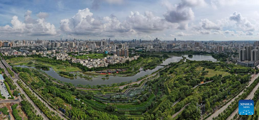 This aerial photo taken on Aug. 10, 2023 shows the Evergreen Park in Haikou, south China's Hainan Province. In recent years, Haikou has embarked on a green, sustainable and high-quality development journey via building wetland parks with ecological water conservancy projects, promoting the construction of beautiful bays and developing the modern environmental manage system. (Xinhua/Yang Guanyu)