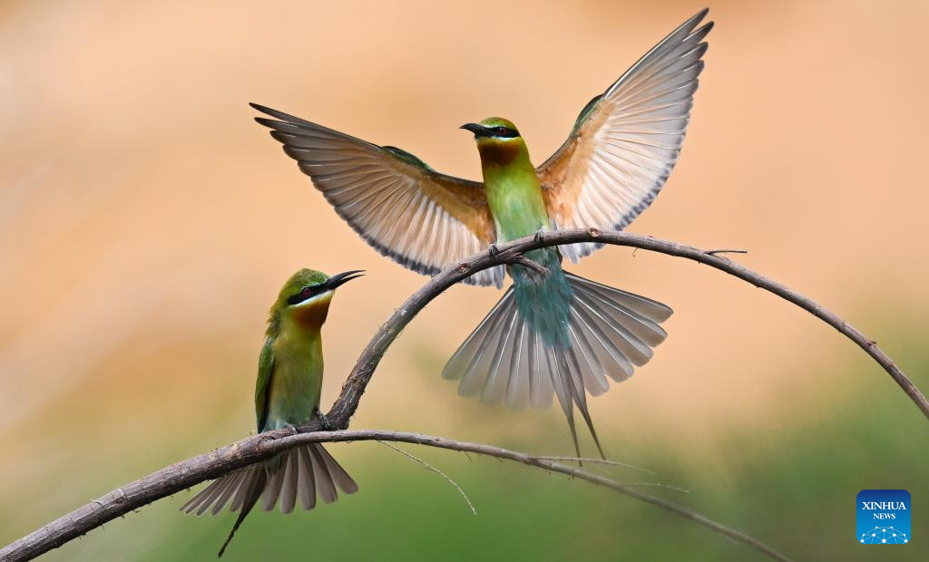 This photo taken on April 16, 2022 shows blue-tailed bee-eaters at Wuyuan River National Wetland Park in Haikou, south China's Hainan Province. In recent years, Haikou has embarked on a green, sustainable and high-quality development journey via building wetland parks with ecological water conservancy projects, promoting the construction of beautiful bays and developing the modern environmental manage system. (Xinhua/Yang Guanyu)