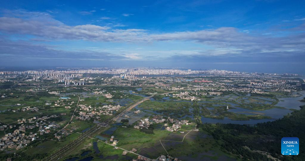 This aerial photo taken on Aug. 6, 2023 shows a view of Haikou, south China's Hainan Province. In recent years, Haikou has embarked on a green, sustainable and high-quality development journey via building wetland parks with ecological water conservancy projects, promoting the construction of beautiful bays and developing the modern environmental manage system. (Xinhua/Yang Guanyu)