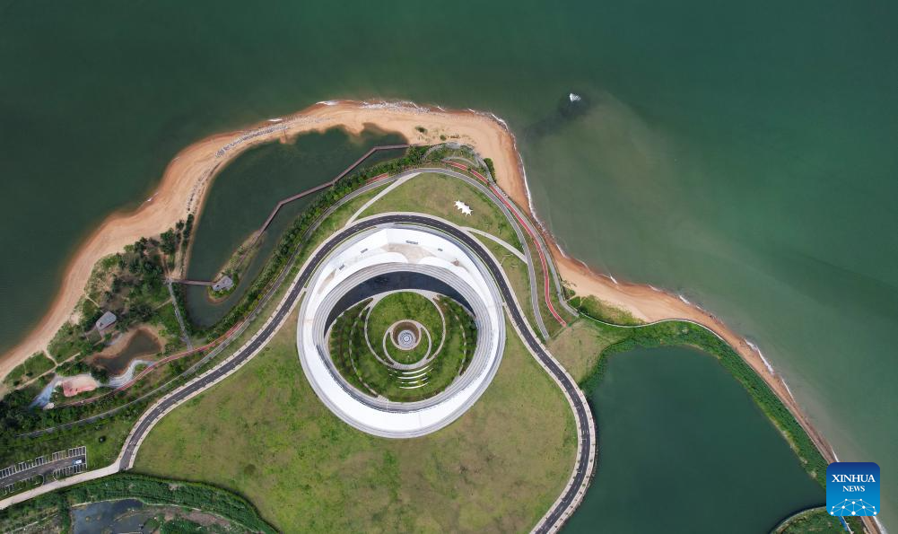This aerial photo taken on Aug. 3, 2023 shows the Baishamen Park in Haikou, south China's Hainan Province. In recent years, Haikou has embarked on a green, sustainable and high-quality development journey via building wetland parks with ecological water conservancy projects, promoting the construction of beautiful bays and developing the modern environmental manage system. (Xinhua/Yang Guanyu)