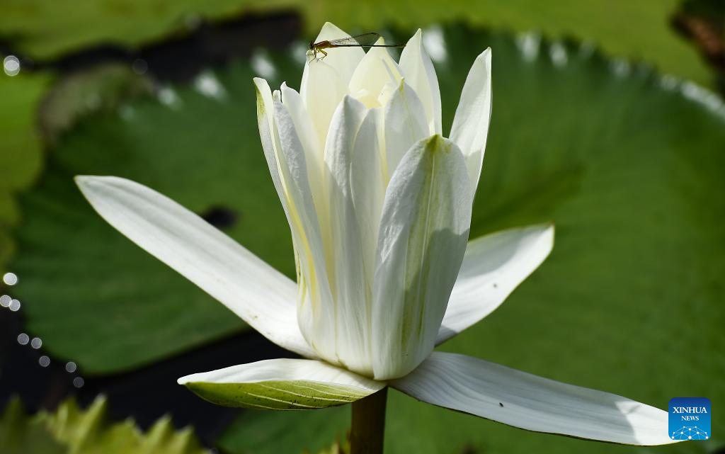 This photo taken on Aug. 2, 2023 shows a lotus at Meishe River Fengxiang Wetland Park in Haikou, south China's Hainan Province. In recent years, Haikou has embarked on a green, sustainable and high-quality development journey via building wetland parks with ecological water conservancy projects, promoting the construction of beautiful bays and developing the modern environmental manage system. (Xinhua/Yang Guanyu)