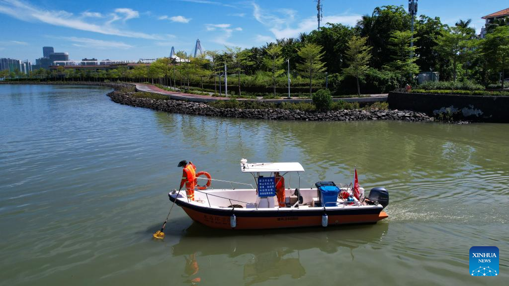 This aerial photo taken on Aug. 9, 2023 shows sanitation workers working in Haikou Bay in Haikou, south China's Hainan Province. In recent years, Haikou has embarked on a green, sustainable and high-quality development journey via building wetland parks with ecological water conservancy projects, promoting the construction of beautiful bays and developing the modern environmental manage system. (Xinhua/Yang Guanyu)