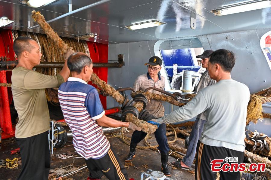 Fishermen conduct maintenance on a boat at Zhapo National Port in Yangjiang, south China's Guangdong Province, Aug. 15, 2023. (Photo: China News Service/Chen Jimin)
