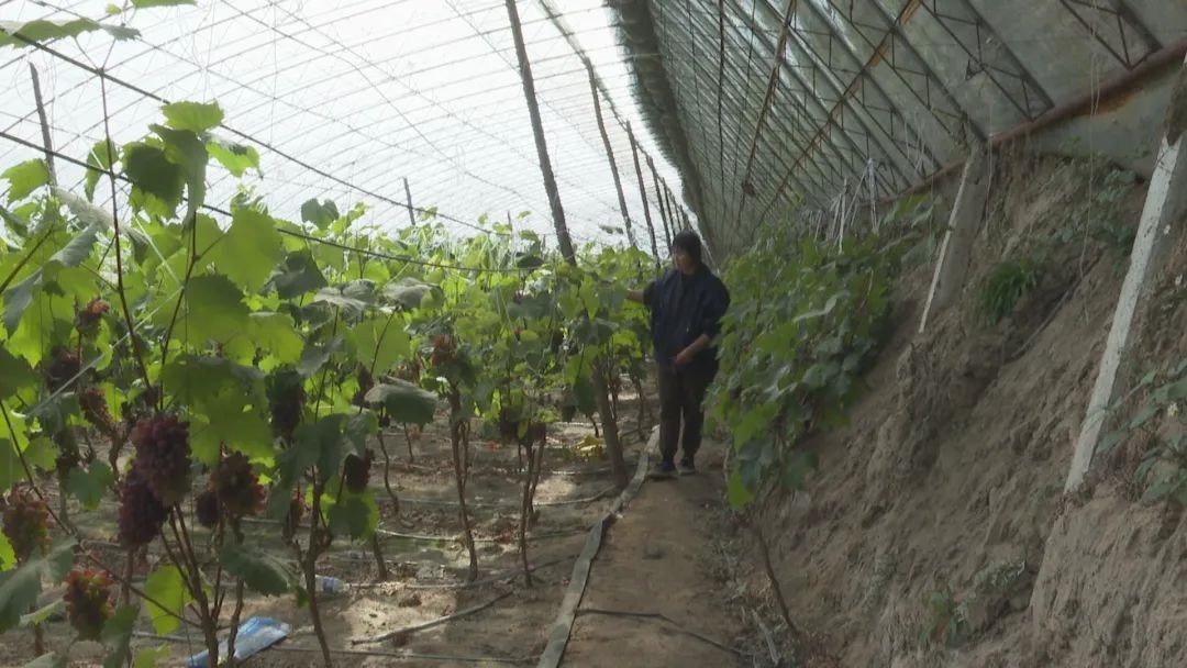 A farmer checks the growth of grapes in a greenhouse in Hantuozi village, Xinmin, northeast China's Liaoning province. (Photo from the media center of Xinmin)