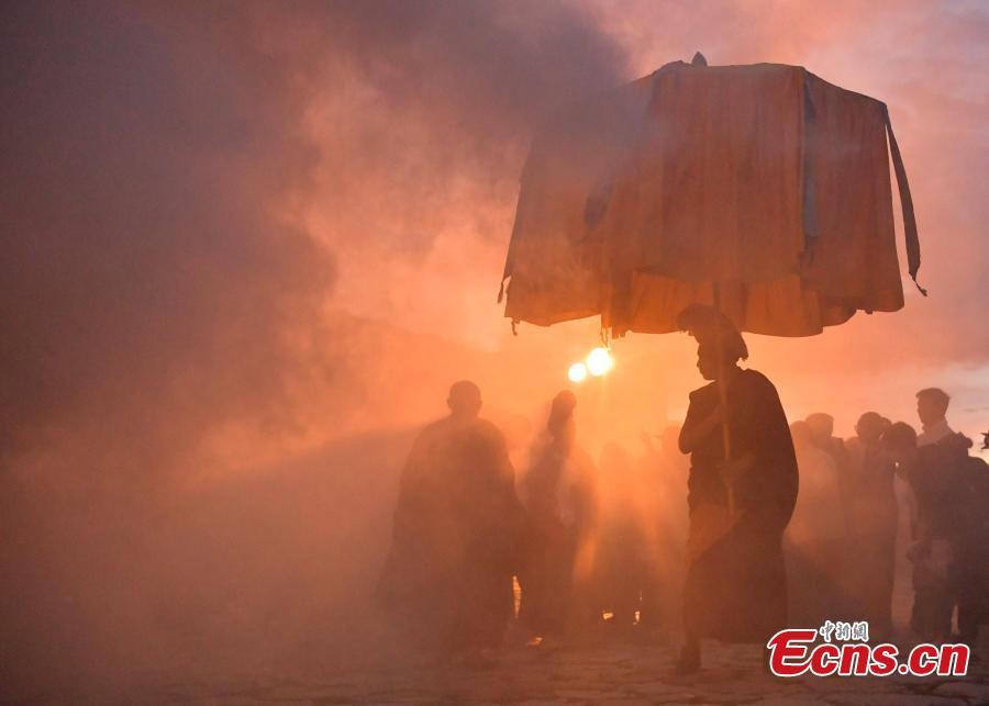 Tibetan monks prepare to celebrate the traditional Shoton Festival, or Yogurt Festival at the Drepung Monastery in Lhasa, southwest China's Tibet Autonomous Region, Aug. 16, 2023. (Photo: China News Service/Li Lin)