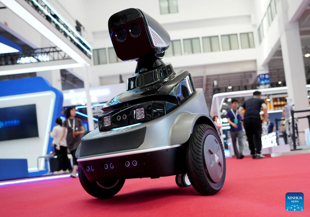 A patrol robot capable of fire and theft detection is on duty at the World Robot Conference 2023 in Beijing, capital of China, Aug. 16, 2023. The World Robot Conference 2023 opened here Wednesday, showcasing cutting-edge achievements and the latest robot industry exhibits. (Xinhua/Wang Yuguo)