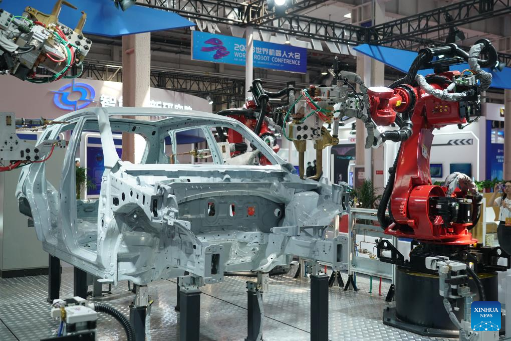 Welding robots are pictured at the World Robot Conference 2023 in Beijing, capital of China, Aug. 16, 2023. The World Robot Conference 2023 opened here Wednesday, showcasing cutting-edge achievements and the latest robot industry exhibits. (Xinhua/Peng Ziyang)