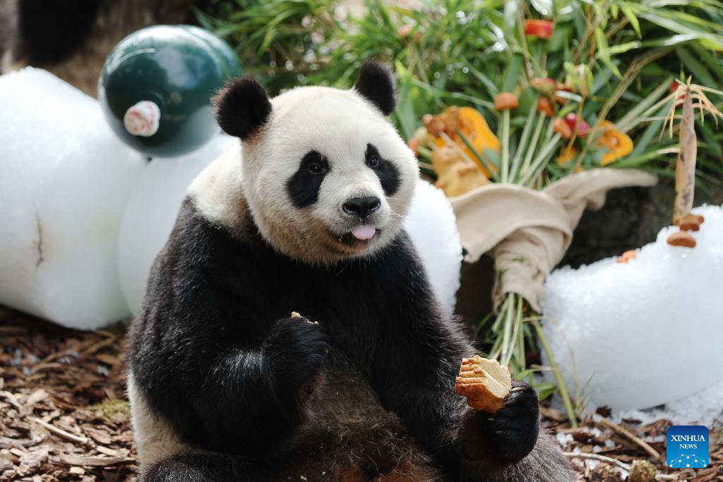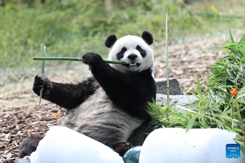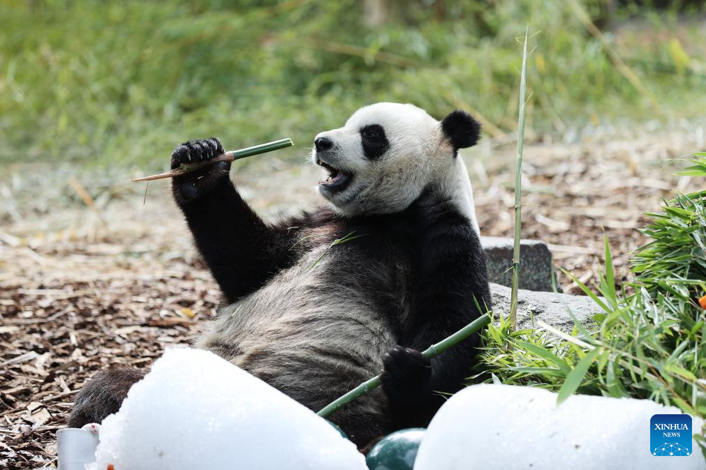 Giant panda Bao Mei has birthday meal at the Pairi Daiza zoo in Brugelette, Belgium, on Aug. 16, 2023. The celebration of the fourth birthday of the panda twins Bao Di and Bao Mei, born on Aug. 8, 2019, was held at the Pairi Daiza zoo on Wednesday. (Xinhua/Zhao Dingzhe)