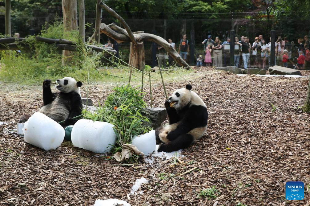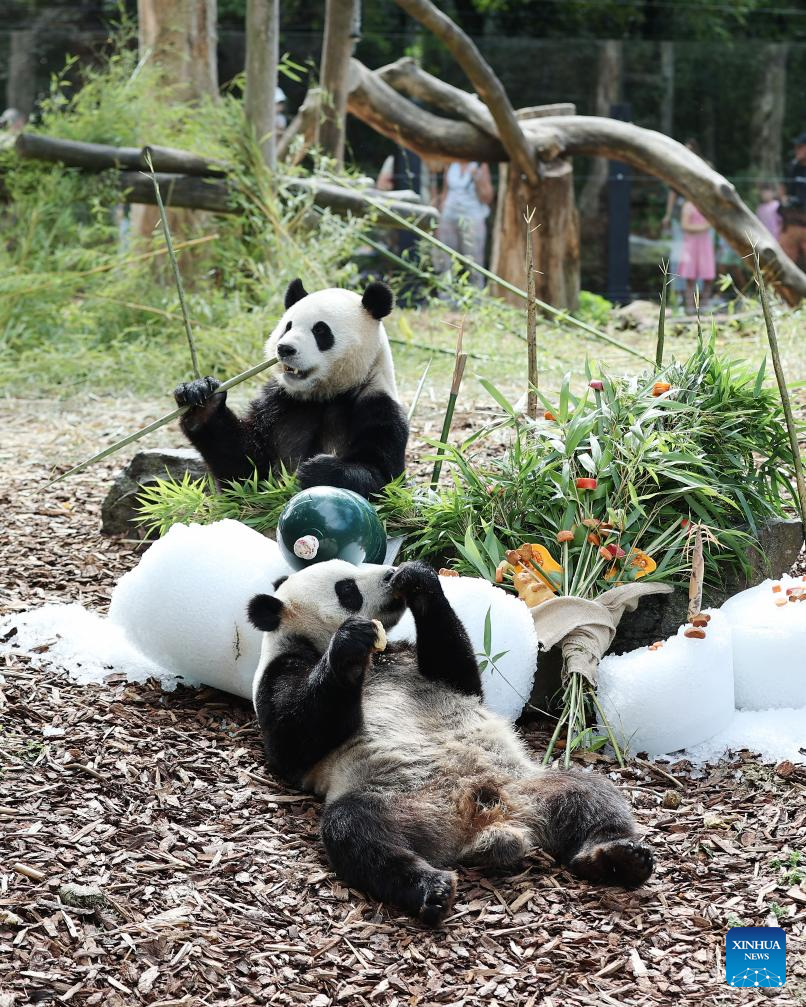 Giant panda twins Bao Di (rear) and Bao Mei have birthday meal at the Pairi Daiza zoo in Brugelette, Belgium, on Aug. 16, 2023. The celebration of the fourth birthday of the panda twins Bao Di and Bao Mei, born on Aug. 8, 2019, was held at the Pairi Daiza zoo on Wednesday. (Xinhua/Zhao Dingzhe)