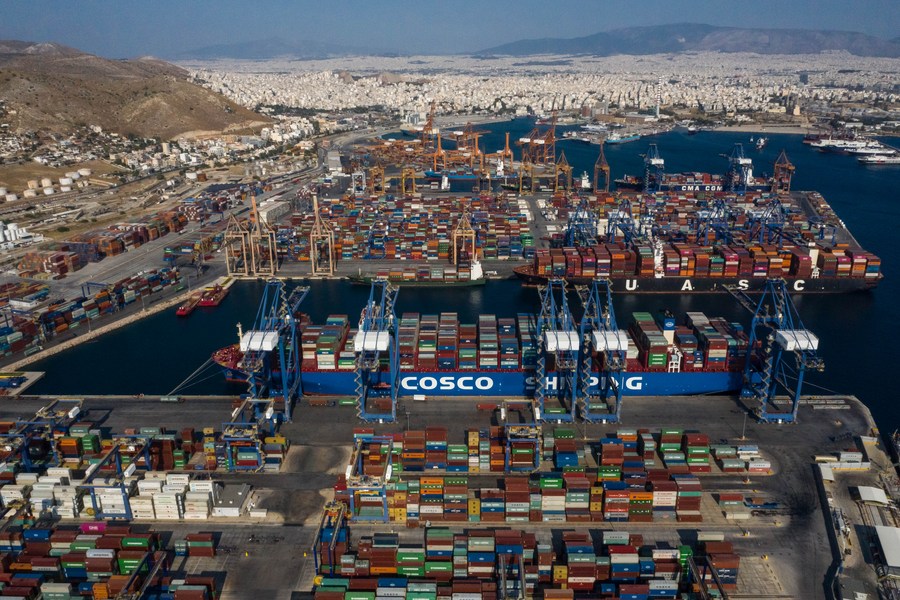 Aerial photo taken on Sept. 6, 2019 shows a cargo ship of COSCO Shipping Lines at the Port of Piraeus in Greece. (Photo by Lefteris Partsalis/Xinhua)