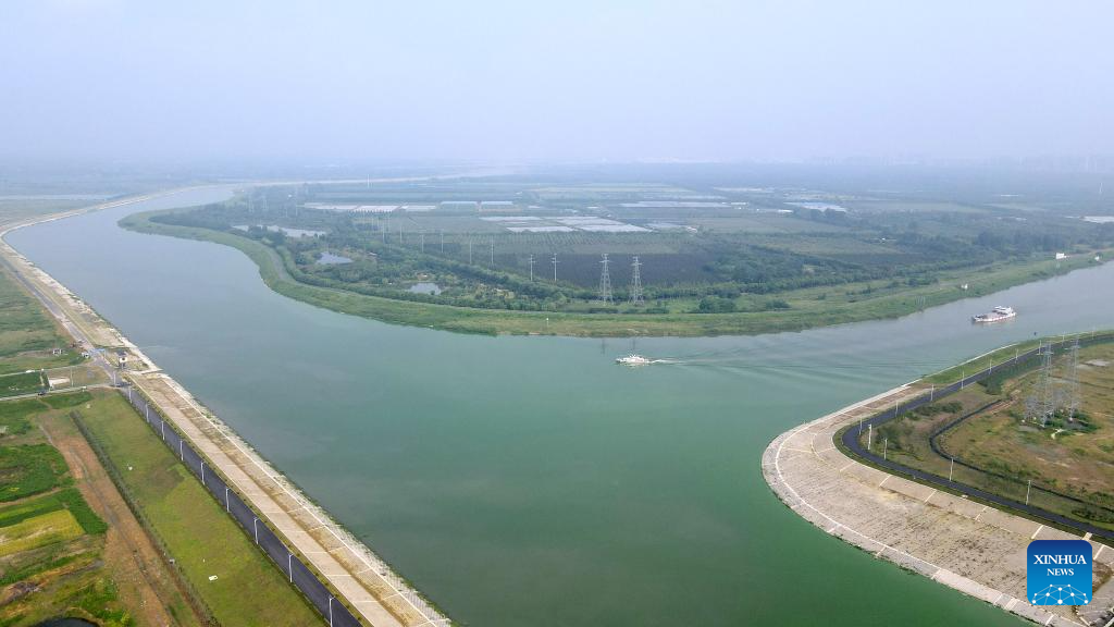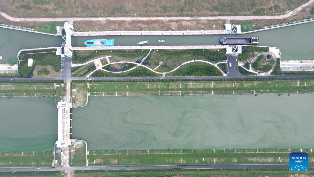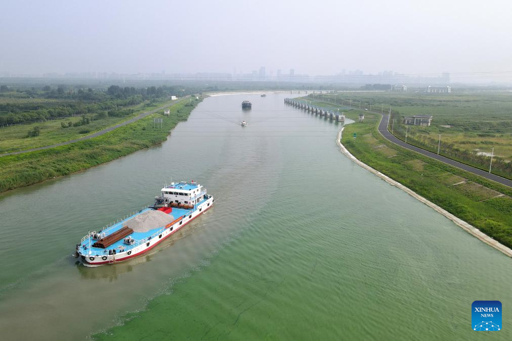 This aerial photo taken on Aug. 16, 2023 shows ships sailing on a new shipping route of a mega water diversion project in east China's Anhui Province. An essential section of the shipping route on the mega water diversion project started trial operation on Wednesday. The project aims to divert water from the Yangtze, China's longest river, to the Huaihe River. (Xinhua/Huang Bohan)