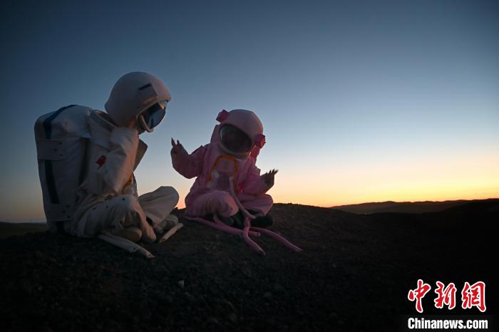 Tourists wearing "space suits" pose for photos at the Ulan Hada volcano group in Ulanqab city, north China's Inner Mongolia Autonomous Region. (Chinanews.com/Liu Wenhua)