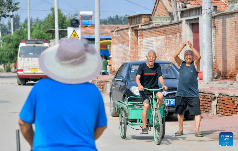 Villagers return home in Shaoqidi Village of Huanghuadian Township, Wuqing District, north China's Tianjin, Aug. 17, 2023. A total of 15,011 people, the last batch of those who were previously relocated from areas prone to flooding by the Yongding River, returned to their homes in 14 villages of Wuqing on Thursday. At present, the power, water, and gas supply have been restored in the villages, and the assessment and reconstruction of damaged facilities are underway in the local areas. (Xinhua/Sun Fanyue)