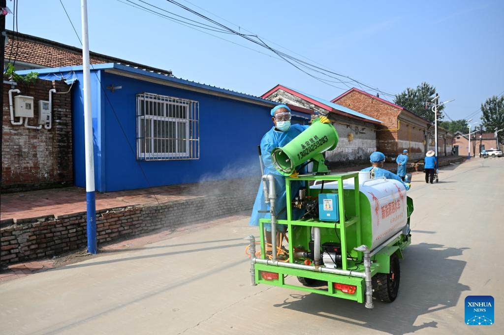A worker carries out disinfection operations in Shaoqidi Village of Huanghuadian Township, Wuqing District, north China's Tianjin, Aug. 17, 2023. A total of 15,011 people, the last batch of those who were previously relocated from areas prone to flooding by the Yongding River, returned to their homes in 14 villages of Wuqing on Thursday. At present, the power, water, and gas supply have been restored in the villages, and the assessment and reconstruction of damaged facilities are underway in the local areas. (Xinhua/Sun Fanyue)