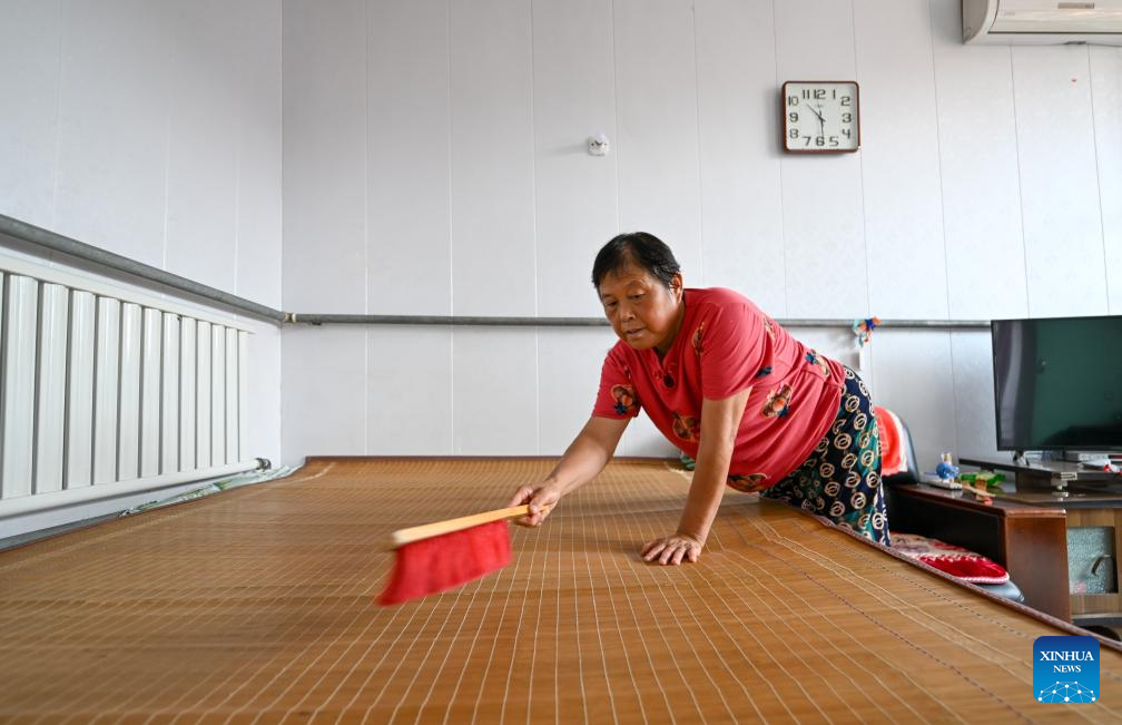A villager arranges the bed after returning home in Shaoqidi Village of Huanghuadian Township, Wuqing District, north China's Tianjin, Aug. 17, 2023. A total of 15,011 people, the last batch of those who were previously relocated from areas prone to flooding by the Yongding River, returned to their homes in 14 villages of Wuqing on Thursday. At present, the power, water, and gas supply have been restored in the villages, and the assessment and reconstruction of damaged facilities are underway in the local areas. (Xinhua/Sun Fanyue)