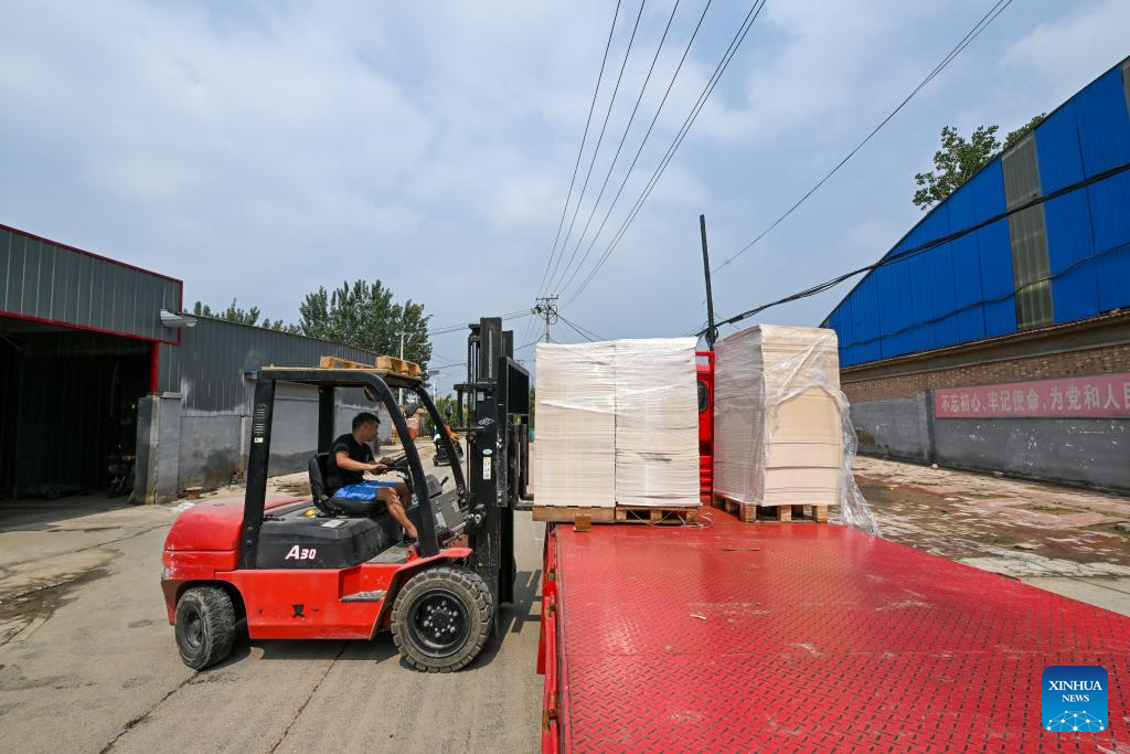 A worker of a paper products company transfers materials and prepares for production in Shaoqidi Village of Huanghuadian Township, Wuqing District, north China's Tianjin, Aug. 17, 2023. A total of 15,011 people, the last batch of those who were previously relocated from areas prone to flooding by the Yongding River, returned to their homes in 14 villages of Wuqing on Thursday. At present, the power, water, and gas supply have been restored in the villages, and the assessment and reconstruction of damaged facilities are underway in the local areas. (Xinhua/Sun Fanyue)