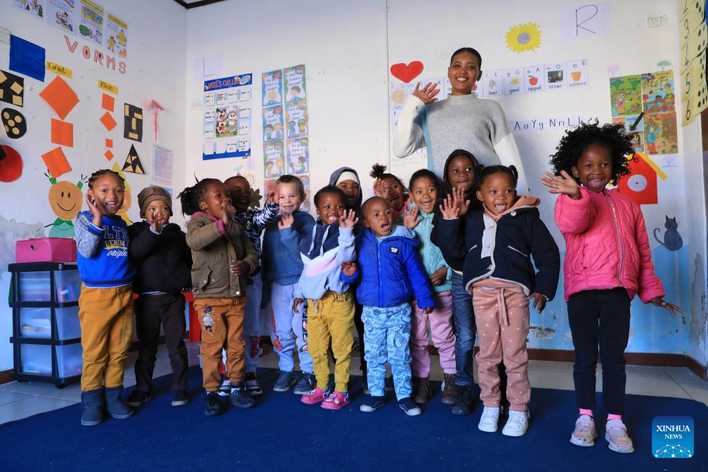 Children play at an early learning center in De Aar Town, more than 750 kilometers northeast of Cape Town, South Africa, on Aug. 11, 2023. This early learning center was funded by Longyuan South Africa Renewables of China Longyuan Power Group Corporation Limited, which has funded the establishment of four early learning centers in De Aar to provide education for children from poor families. Nearly 500 children in need have been admitted to these learning centers so far. (Xinhua/Dong Jianghui)