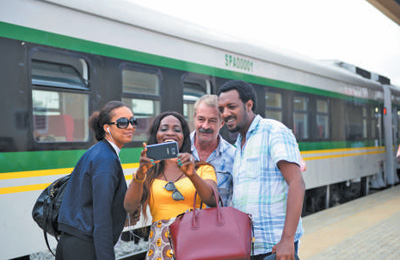 Photo shows passengers taking photos in front of a train along Nigeria's Abuja-Kaduna Railway. Built by China Civil Engineering Construction Corporation (CCECC), the railway has a total length of 186.5 km, and connects the capital Abuja with the northern industrial hub Kaduna. The railway has greatly facilitated the exchange of personnel and goods, promoting Nigeria's economic development. (Photo/Yang Hongjie)