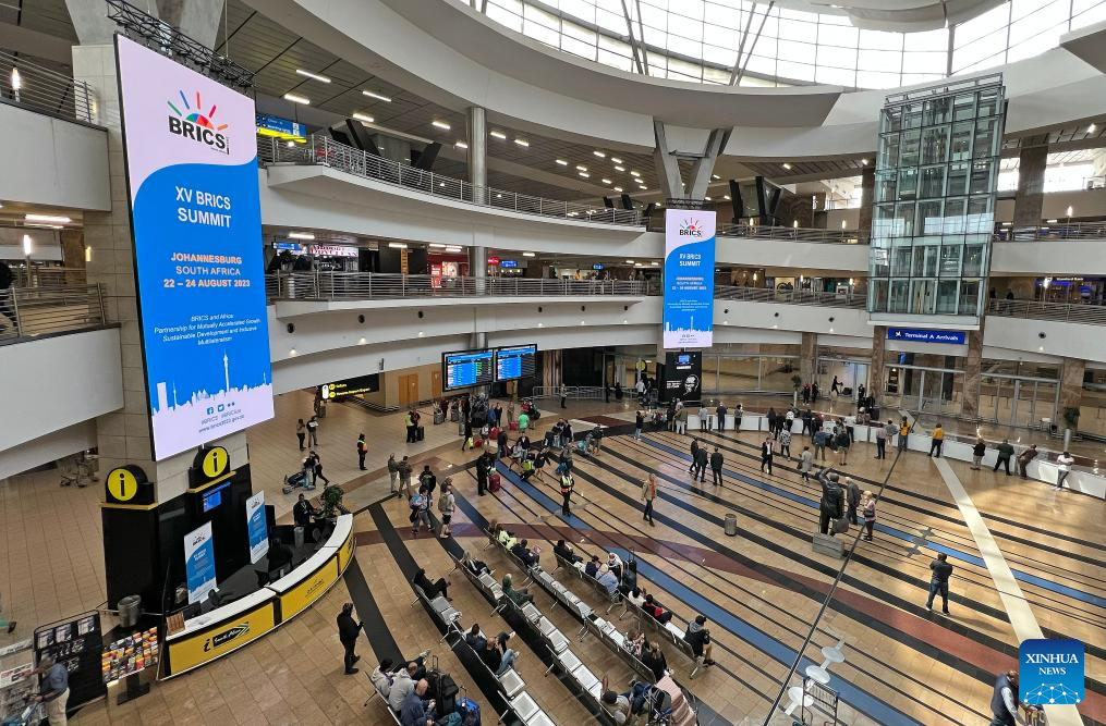 Electronic screens of the 15th BRICS summit are seen at the O.R. Tambo International Airport in Johannesburg, South Africa, Aug. 16, 2023. The 15th BRICS summit is to be held in Johannesburg, South Africa, on Aug. 22-24. (Xinhua/Chen Cheng)