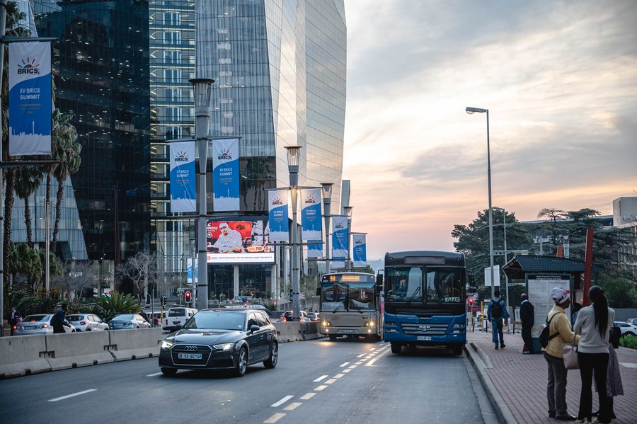 Signboards of the 15th BRICS summit are seen in a street of Johannesburg, South Africa, Aug. 17, 2023. The 15th BRICS summit is to be held in Johannesburg, South Africa, on Aug. 22-24. (Xinhua/Wang Guansen)