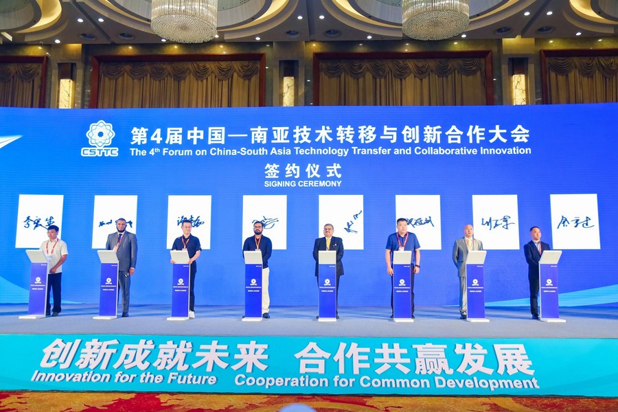 This photo taken on Aug. 16, 2023 shows a signing ceremony at the 4th Forum on China-South Asia Technology Transfer and Collaborative Innovation held in Kunming, capital of southwest China's Yunnan Province. (Xinhua)