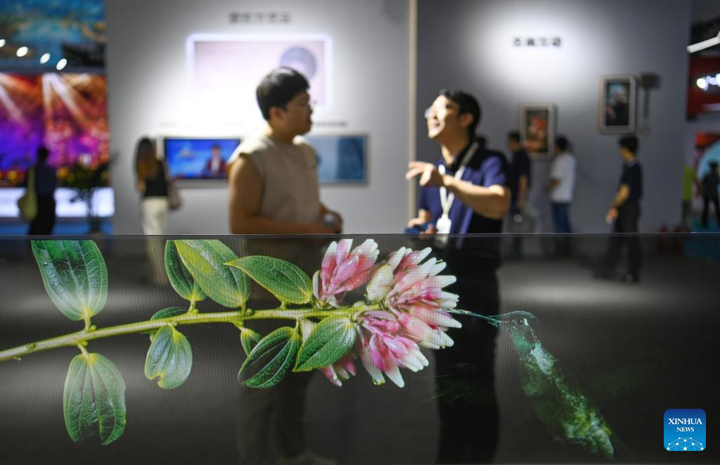 A visitor learns about an OLED display in the digital culture exhibition area at the 10th West China Culture Industries Expo in Xi'an, northwest China's Shaanxi Province, Aug. 18, 2023. The 10th West China Culture Industries Expo opened on Thursday in Xi'an and will last till Aug. 20. The digital culture exhibition area of the expo features the latest achievements in the application of digital technology in the cultural industry, providing immersive experience of digital culture for the visitors. (Xinhua/Zou Jingyi)