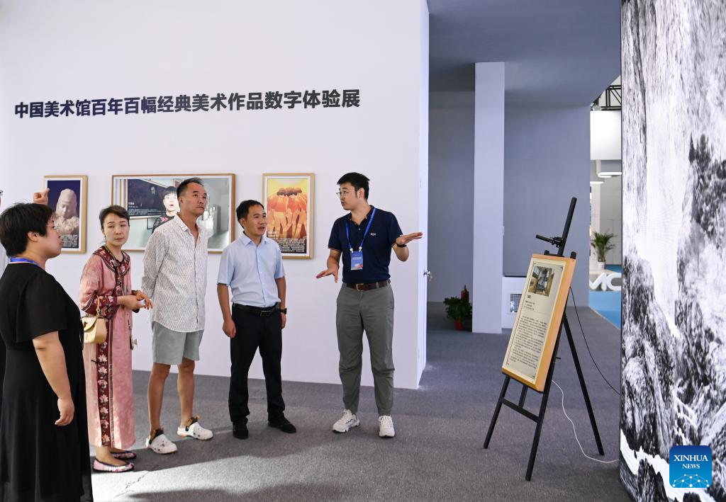 A visitor tries a digital device to interact with a painting in the digital culture exhibition area at the 10th West China Culture Industries Expo in Xi'an, northwest China's Shaanxi Province, Aug. 18, 2023. The 10th West China Culture Industries Expo opened on Thursday in Xi'an and will last till Aug. 20. The digital culture exhibition area of the expo features the latest achievements in the application of digital technology in the cultural industry, providing immersive experience of digital culture for the visitors. (Xinhua/Zou Jingyi)