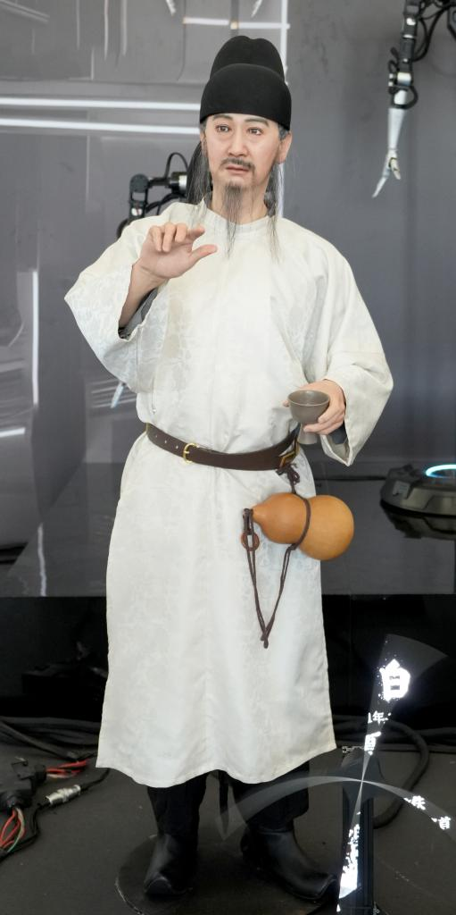 A humanoid robot resembling ancient Chinese poet Li Bai performs at the World Robot Conference 2023 in Beijing, capital of China, Aug. 16, 2023.(Xinhua/Wang Yuguo)