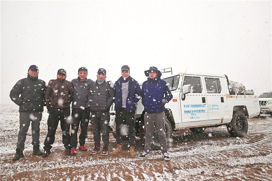 A patrol from the Drolkar Lake protection station of Hoh Xil pose in the snow for a photo. ZHANG HONGXIANG/XINHUA