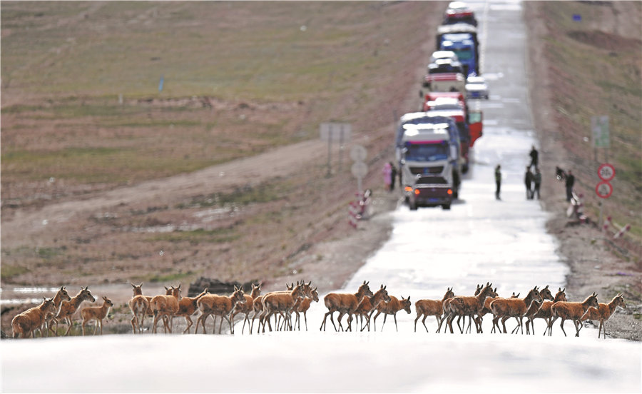 Tibetan antelopes cross the Qinghai-Tibet Highway in a leisurely fashion and head toward the Sanjiangyuan area in Northwest China's Qinghai province, last month. ZHANG HONGXIANG/XINHUA