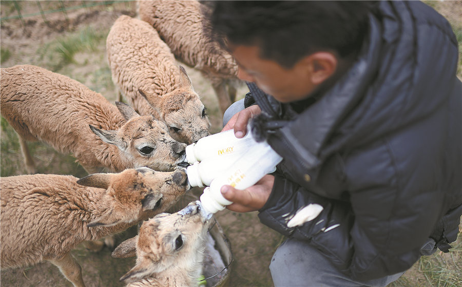 Rescued baby Tibetan antelopes are fed. ZHANG HONGXIANG/XINHUA