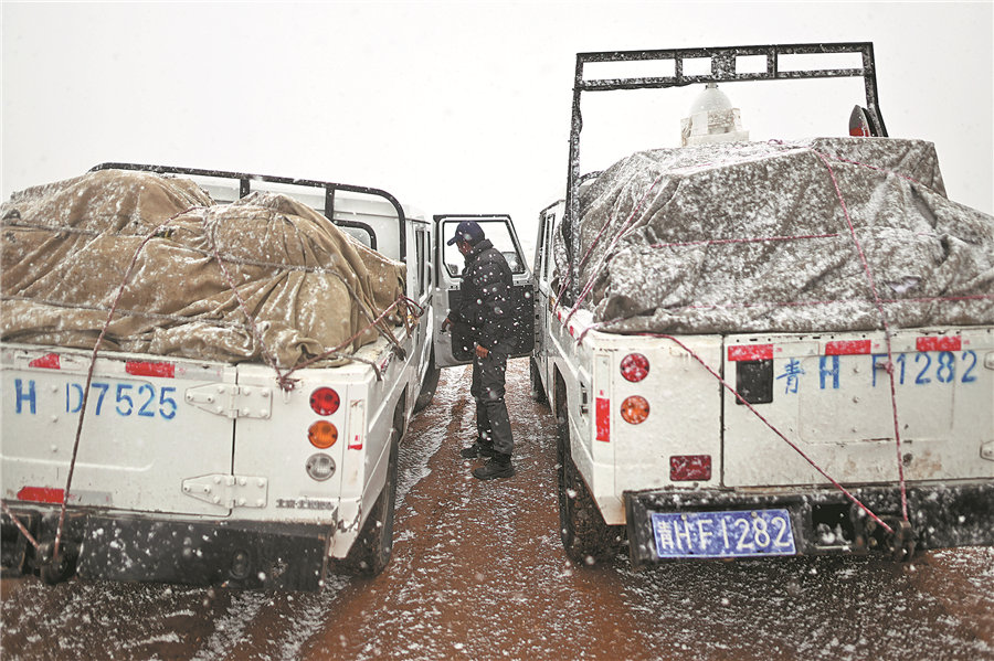 Two rangers examine a vehicle's engine during a recent patrol in Hoh Xil, which is located in Sanjiangyuan National Park in Northwest China's Qinghai province. ZHANG HONGXIANG/XINHUA