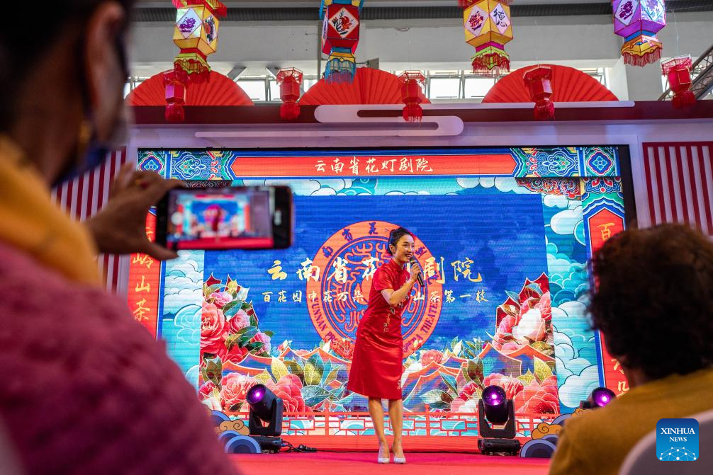 Artists perform in the Culture and Tourism Pavilion at the seventh China-South Asia Expo in Kunming, southwest China's Yunnan Province, Aug. 19, 2023. The ongoing seventh China-South Asia Expo has attracted more than 30,000 exhibitors, representatives, and guests from 85 countries and regions to attend online and offline. (Xinhua/Hu Chao)