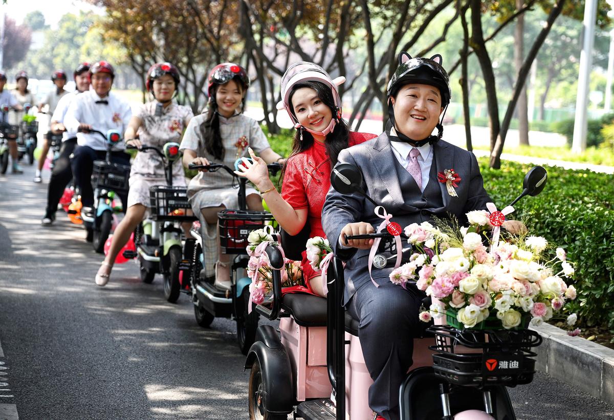 Zheng Chenglong, a resident of Luoyang city in central China's Henan Province, escorts his bride, Gao Mingze, to their wedding with a fleet of electric mopeds ridden by his family, relatives, and friends on Aug. 13, 2023. By picking up the bride in this low-carbon, simple, and romantic way, the couple wanted to promote a new trend of civilized and harmonious wedding celebrations, and showcase the new demeanor of the youth of today, the newlyweds said. (Photo/vip.people.com.cn)