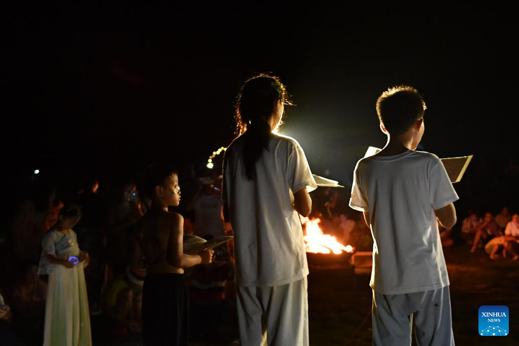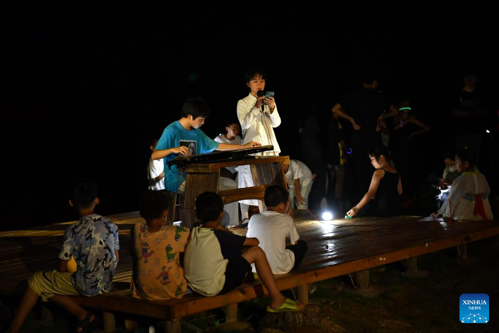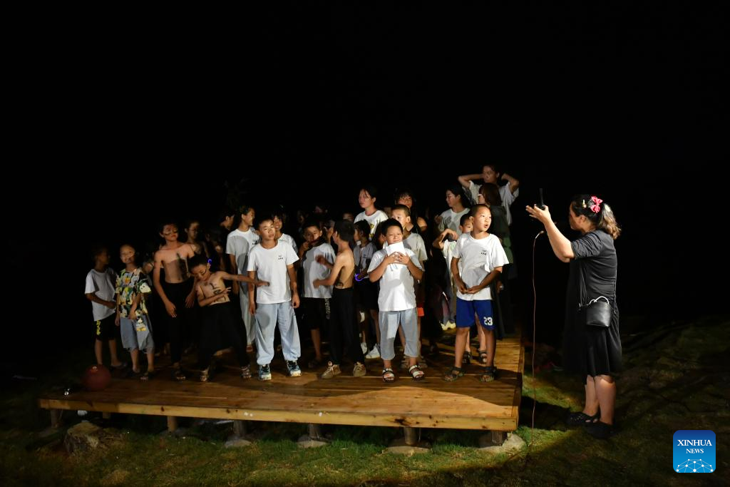 Children and teachers perform during an art festival in Ningyuan County of central China's Hunan Province, Aug. 20, 2023. (Xinhua/Chen Zhenhai)
