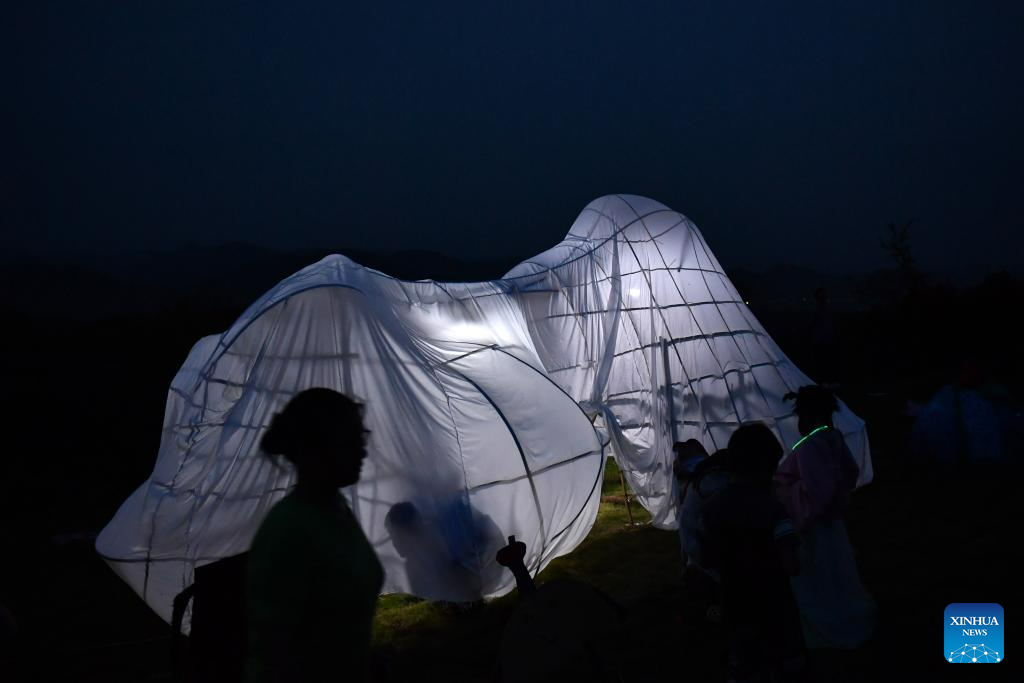 Children play inside an art installation in Ningyuan County of central China's Hunan Province, Aug. 20, 2023. (Xinhua/Chen Zhenhai)