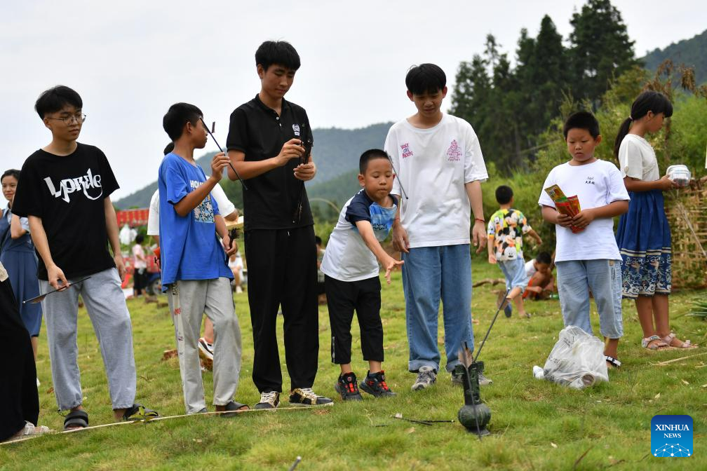Children play Touhu game, or pitch-pot, an ancient entertainment that requires players to throw arrows from a set distance into a pot, during an art festival in Ningyuan County of central China's Hunan Province, Aug. 20, 2023. (Xinhua/Chen Zhenhai)