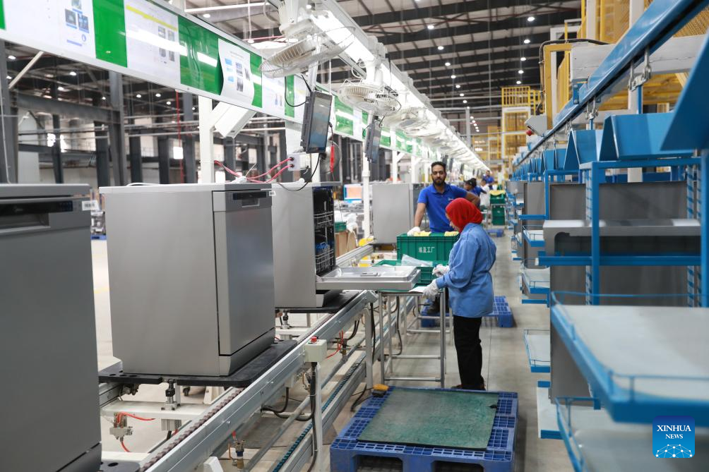 Workers work on the dishwasher production line of Midea (Egypt) Kitchen &Water Heater Appliances Co., Ltd. at the China-Egypt TEDA Suez Economic and Trade Cooperation Zone in Suez province, Egypt, Aug. 10, 2023. (Xinhua/Sui Xiankai)