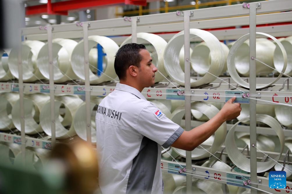Workers operate on the fiberglass production line of Jushi Egypt Fiberglass Co., Ltd. at the China-Egypt TEDA Suez Economic and Trade Cooperation Zone in Suez province, Egypt, Aug. 10, 2023. (Xinhua/Sui Xiankai)