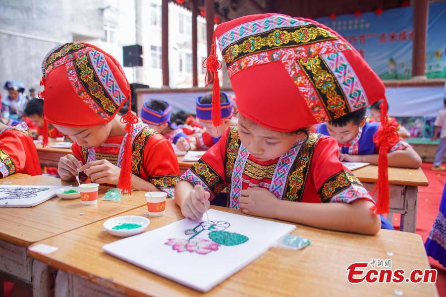 Children make rice drawings during "Saiqiao Festival", a celebration of the Qixi Festival in Nanning, south China's Guangxi Zhuang Autonomous Region, Aug. 21, 2023. (Photo: China News Service/Chen Guanyan)