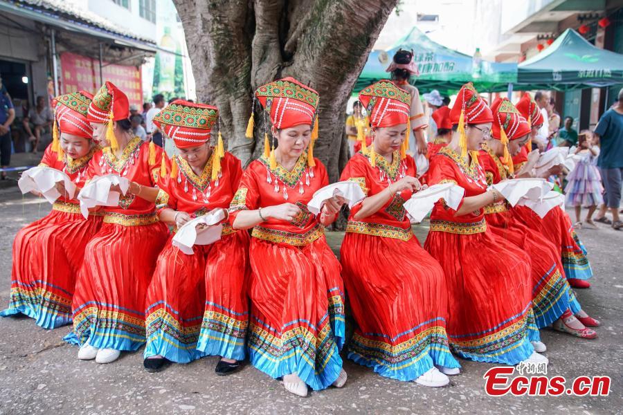 Local women in ethnic costumes compete in an embroidery contest during "Saiqiao Festival", a celebration of the Qixi Festival in Nanning, south China's Guangxi Zhuang Autonomous Region, Aug. 21, 2023. (Photo: China News Service/Chen Guanyan)