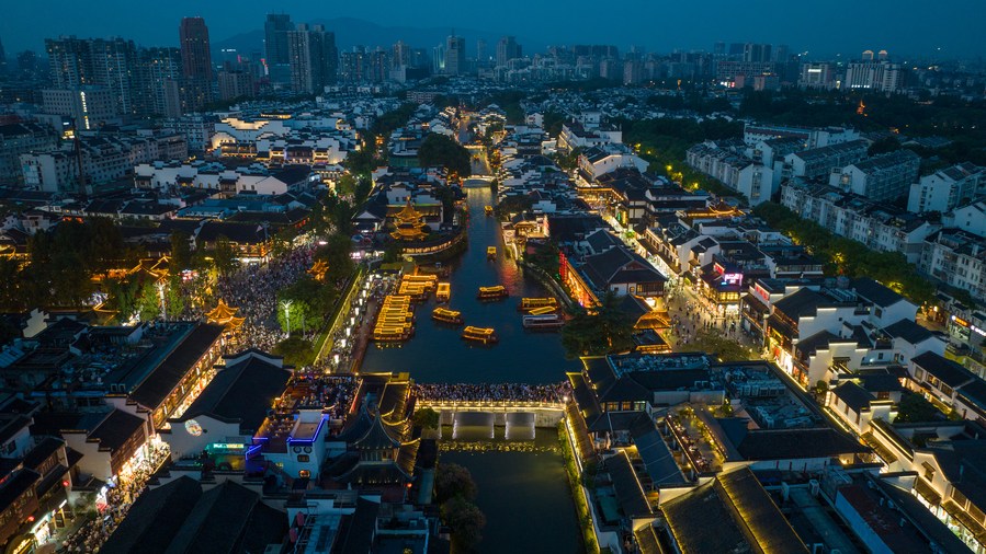 NANJING, Aug. 22 (Xinhua) -- Qinhuai District of Nanjing, capital of east China's Jiangsu Province, has been boosting and diversifying its tourism economy in recent years through joint efforts in entertainment, sightseeing, catering and shopping services. A number of tourist attractions designed for nighttime visit were established there to enrich the nightlife of both tourists and local residents, and infuse new vigor into urban consumption.